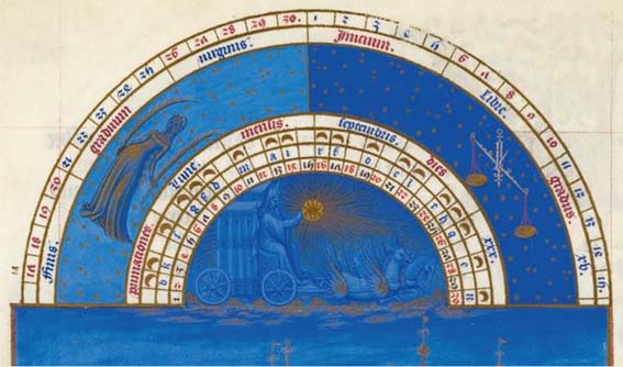 Ainsi, sur une simple enluminure, on voit que des systèmes cohabitent. Sous une forme plus élaborée, figure le symbole astral de la Vierge, et celui de la Balance. Celui qui lit ce livre de prières sait ainsi qu’en septembre, le Soleil se trouve à la fois dans la Vierge et dans la Balance. Et, à proximité des chiffres indo-arabes, il voit l’inscription Finis graduum virginis, fin du degré de la Vierge, et Initium libre gradus XV, début de la Balance au quinzième degré. Cela veut dire qu’au mois de septembre, le Soleil parcourt dans le ciel 29 degrés. Or, septembre, comme cela est indiqué, dure 30 jours. 29 divisé par 30 donne à peu près 58 minutes. Cela veut dire que chaque jour, au mois de septembre, le Soleil se déplace de 58 minutes dans le ciel. Si je vous avais montré la miniature du mois de décembre, vous auriez vu que ce n’est pas 58 minutes ; c’était plus. Si je vous avais montré l’enluminure du mois de juin, vous auriez vu que c’était moins. C’est-à-dire qu’à travers cette graduation, on fait comprendre au lecteur, un peu érudit bien sûr, que le Soleil se déplace plus vite en hiver, et moins vite en été.