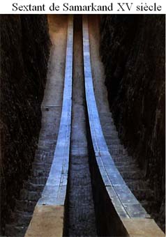 L’invention, par contre, majeure de la période médiévale est le « sextant astronomique ». Lorsqu’on plante un gnomon, on constate que l’extrémité est un peu diluée, qu’il y a une espèce de flou. Cette pénombre du bâton est due au fait que le Soleil n’est pas un astre ponctuel, qu’il a un diamètre apparent, et que le diamètre apparent engendre une pénombre, facteur d’incertitude. Les astronomes se sont alors demandé comment limiter cet effet. Ils imaginent des sortes de chambres noires, des chambres obscures. On en connaît deux qui ont existé de façon certaine. Un à une dizaine de kilomètres de Téhéran, à Ray, et l’autre à Samarkand, en Ouzbékistan. Celui de Samarkand existe toujours. Voici la maquette. Ce sextant astronomique a été construit au XVIe siècle par Ulugh Beg. Il est enterré. Il se présente comme un quart de siècle gradué dont le rayon fait 40 mètres. Celui de Ray faisait 20 mètres. C’est aligné dans la direction du sud géographique. Un petit oculus, un œilleton, permet à la lumière d’entrer et de tomber sur un quart de cercle gradué. On voit donc une tache de lumière dans de l’ombre. On peut, avec ce système, réaliser une mesure de très grande précision. À Samarkand, on voit le système en pierres, avec des marches de chaque côté, et toute une graduation de chaque côté. Le sextant permettait de déterminer un paramètre, dont je vous ai parlé, l’obliquité de l’écliptique. L’axe de la rotation de la Terre est penché. Il pointe vers l’Étoile polaire sensiblement. Cette inclinaison de l’axe de rotation de la Terre est responsable du phénomène de saison, et cette inclinaison de l’axe, qu’on appelle obliquité, change, et cela était un objet de recherche assidu de la part des astronomes de l’Antiquité et du Moyen Âge. Je vais y revenir plus loin, avec un schéma.
