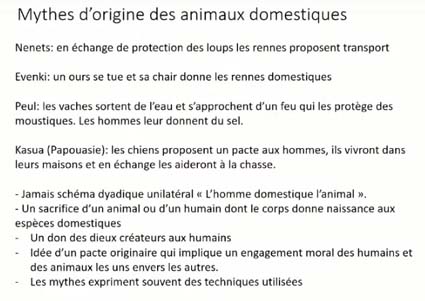 Si on cherche à travers le monde la façon dont les peuples autochtones, les petits éleveurs conceptualisent leurs rapports aux animaux, on a des mythes très intéressants. Chez les Nenetes, c’est en échange d’une protection des loups que les rennes de l’Arctique ont proposé le transport aux humains. Chez les Evenki, c’est un modèle assez différent, l’on retrouve souvent dans les agricultures, un ours est tué et a donné sa chair qui s’est transformée en renne domestique. C’est un sacrifice là véritablement d’un animal qui a un rôle très important chez ces peuples de la forêt et c’est reçu comme un cadeau, à nouveau, on a un aspect d’obligation morale. Sortant de la Sibérie, chez les Peuls, les vaches sont sorties de l’eau, se sont approchées d’un feu, d’un campement, où elles ont trouvé une protection contre un prédateurs, les hyènes, et contre les moustiques, et les hommes leur ont donné du sel, c’est comme cela que l’interaction a commencé. Chez les Kasua, en Papouasie, cela a été relevé par Florence BRUNOIS, les chiens ont proposé un pacte aux hommes, les chiens vont vivre dans leurs maisons et en échange ils aideront les humains à la chasse. On voit qu’avec ces mythes à travers le monde, on n’a jamais un schéma dyadique unilatéral de type occidental : l’homme domestique l’animal. On a un don des dieux créateurs aux humains, quelquefois ; on a l’idée, souvent, d’une initiative spontanée des animaux, et toujours l’idée d’un engagement moral des humains et des animaux, les uns envers les autres. Ce n’est pas de la blague tout cela, cela permet d’expliquer aussi des techniques qui sont utilisées actuellement par les gens. Le fait de donner du sel, que l’on voit aussi bien chez les Peuls ou en Afrique chez les (manque le nom, incompris), eh bien c’est dans le mythe et c’est dans les pratiques quotidiennes. Les foyers qui servent à attirer les bétails, c’est dans les pratiques en Sibérie comme en Afrique, on va allumer des feux pour attirer le bétail.