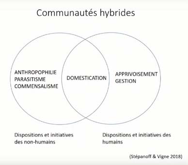 On a formalisé cela dans un texte, avec Jean-Denis VIGNE, avec cette notion de communautés hybrides, qui permet de prendre un peu de recul avec juste la vision de la domestication intégrée, et d’essayer de prendre en compte toutes les formes parallèles, voisines, de relations avec d’un côté, cela peut être des initiatives des non-humains, qui ont eu envie d’aller vivre avec les humains et les humains ne les aiment pas, c’est : le parasitisme, le commensalisme, l’anthropophilie, les rats typiquement, ils nous aiment beaucoup mais nous, on ne les aiment pas. communauté intégrée, jusqu’au moment où on va les accepter, trouver un intérêt, les rats de laboratoire, et nous on va les gérer, là, il y aura une initiative humaine. Donc, quand vont converger les intérêts des deux côtés, on a la domestication. C’est modèle qui peut se rapprocher des modèles des peuples autochtones, qui vivent au quotidien, eux, avec les animaux domestiques.