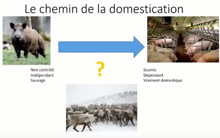 Le problème est : où mettre dans cette histoire-là, dans ce chemin, des formes d’élevages différents, comme les truies, des systèmes d’élevage de porcs où on n’élève que les femelles et où les truies sont couvertes par des sangliers, ou bien les porcs à la glandée - vous voyez sur l’image qu’on avait beaucoup de croisement avec des sangliers, ou l’élevage de rennes en Sibérie, dans lequel on a énormément de croisements avec des rennes sauvages ?