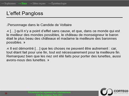 Les créationnistes se basent sur l’effet Pangloss, du nom d’un personnage de Voltaire. Je vous laisse lire ma présentation. Je ne lis que les passages les plus importants :