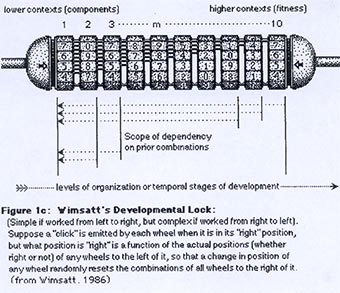 Cette grande question de l’évolution-développement est illustrée ici par ce petit système de verrous. Nous disposons d’un système fonctionnel de caractères et de stades. Il n’y a qu’une seule solution possible. Comment arrive-t-on, au cours de l’évolution, à la mise en place de cette solution, si nous n’avons pas le droit à des essais et à des erreurs (c’est-à-dire si les solutions partielles comme les mutants de la drosophile ci-dessus ne sont pas viables) ? La question est donc : Comment mettre en place une séquence complexe au cours de l’évolution ?